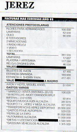 El Ayuntamiento, casi recién trasladado desde Madre de Dios a su ubicación actual en calle Consistorio, vivía a todo trapo, pese a la crisis que sacudió al país en aquel año. Casi 382.000 pesetas en un equipo de música para el Audi de Alcaldía; 106.000 pesetas en mariscos en la Venta Antonio; 62.000 pesetas en lámparas; 90.000, en óleos, seis tostadores, dos minicadenas, un radio reloj, un vídeo y una secadora; 46.500 pesetas en relojes Longines de señora... Un no parar. Aparte, se libraron 30 millones de las antiguas pesetas (180.000 euros) en transferencias al Xerez Deportivo, un club que en aquel momento también sostenía el Ayuntamiento y que hoy, sacudido y esquilmado por todo tipo de saqueadores profesionales, está al filo de la desaparición.