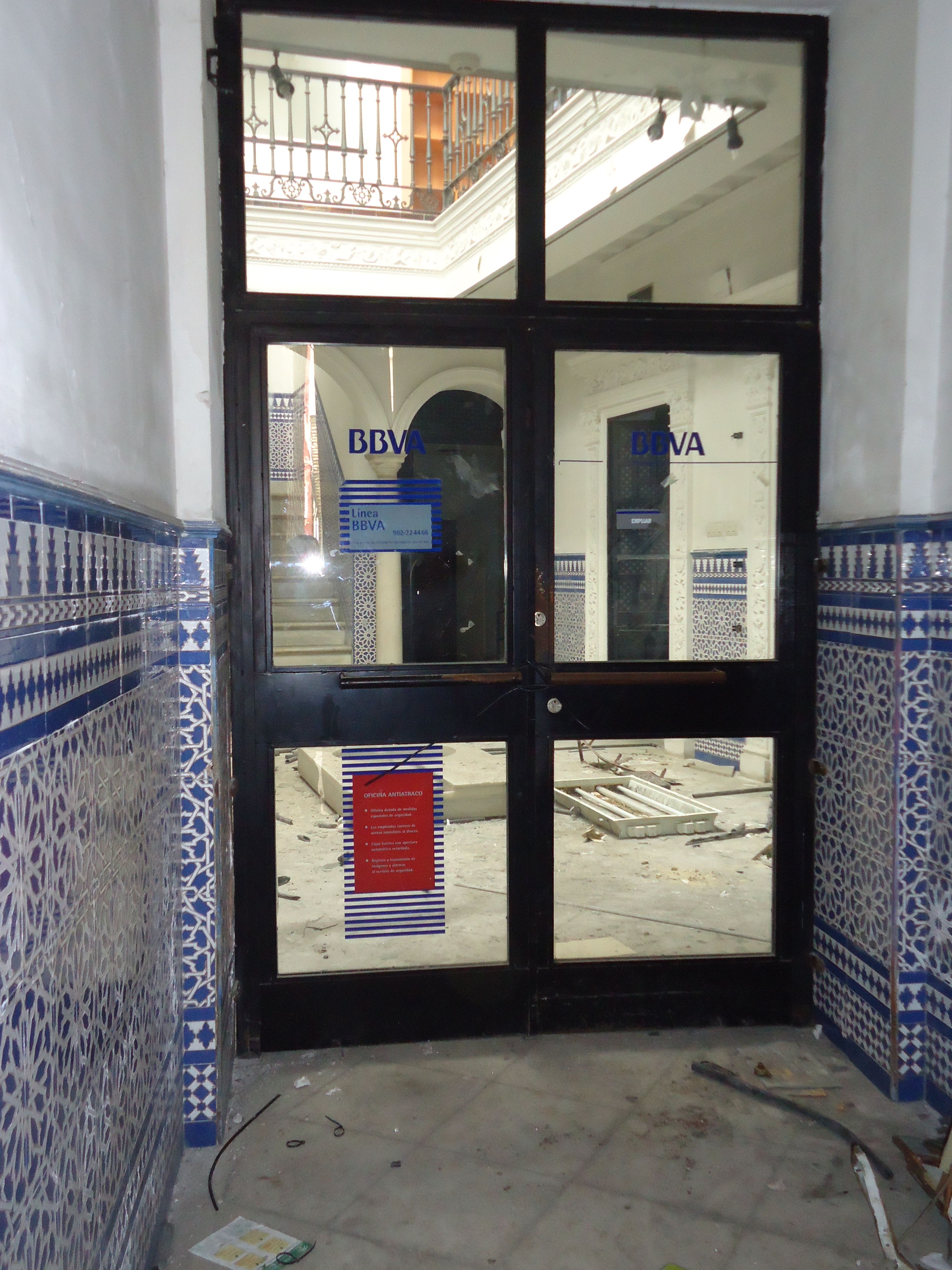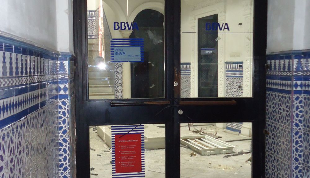 Se trata del inmueble que vio nacer a Manuel Lora Tamayo, "figura preclara de la ciencia española y ministro de Educación Nacional", como así recuerda la placa colocada en la fachada en 1984 para homenajear al que fuera nombrado hijo predilecto de Jerez en 1960. Lo que fue una sucursal de la Caja Rural, de la Caja de Ahorros, del BBVA y antes incluso de la Caja Postal, se encuentra en los últimos años abandonado a su suerte. Recientemente alguien optó por la socorrida patada en la puerta para acceder al inmueble, a saber con qué intenciones, lo que ha permitido tomar estas fotografías en las que se ve el estado que presenta actualmente.