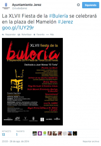 "La Junta directiva y en su nombre el Presidente de la Federación de Peñas Flamencas de Jerez comunica: ante las noticias publicadas en distintos medios de comunicación sobre la Fiesta de la Bulería 2014, los cambios de última hora, decididos por la organización del evento, a nuestro modo de entender precipitados y la mención que se hace referente al "consenso" con la federación de peñas, una vez conocido el alcance, informados oportunamente y hablado entre toda la junta directiva comunicamos lo siguiente :