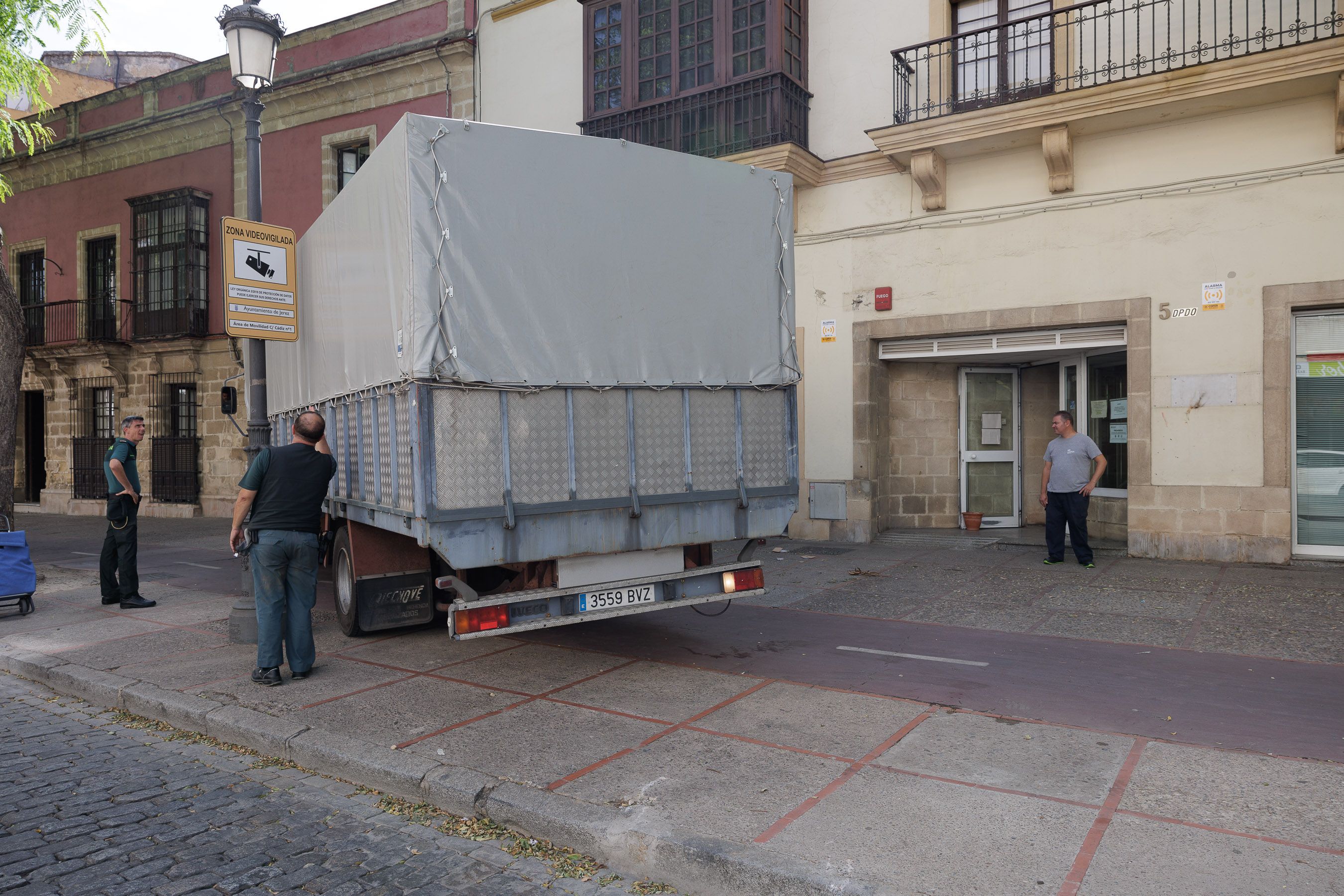 El tráfico cortado, un enorme camión y agentes de Guardia Civil transportando enseres, en un constante ir y venir desde las antiguas oficinas de la Seguridad Social situadas en la calle Ancha de Jerez.