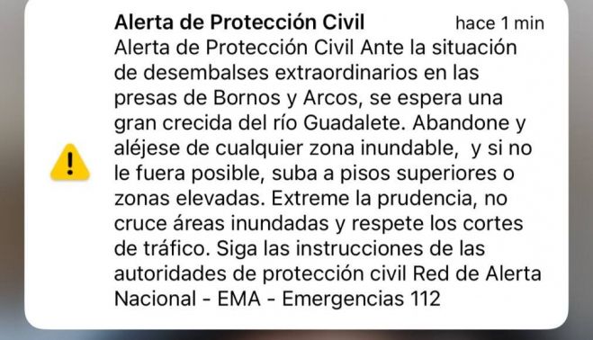 El mensaje, en concreto, señala: "Alerta de Protección Civil Ante la situación de desembalses extraordinarios en las presas de Bornos y Arcos, se espera una gran crecida del río Guadalete. Abandone y aléjese de cualquier zona inundable, y si no le fuera posible, suba a pisos superiores o zonas elevadas. Extreme la prudencia, no cruce áreas inundadas y respete los cortes de tráfico. Siga las instrucciones de las autoridades de protección civil Red de Alerta Nacional - EMA - Emergencias 112".