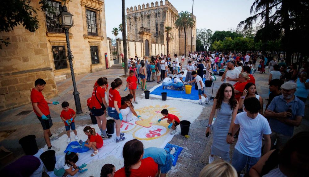 Durante la tarde de este sábado 21 de junio, decenas de voluntarios se han reunido en la Alameda Vieja para confeccionar las tradicionales alfombras de sal, que este año han vuelto a ocupar este emblemático espacio, tal y como ocurrió en la edición anterior. Familias enteras, vecinos y devotos se han sumado a esta bonita labor para aportar su granito de arena.