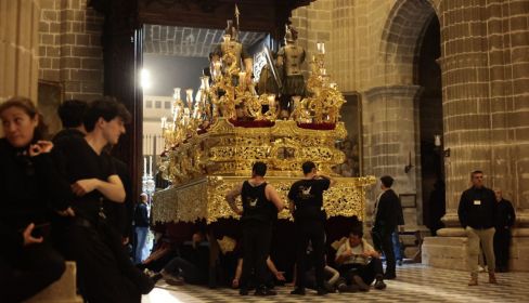 Justo cuando estaba a punto de salir de la Catedral, el paso de misterio de la Flagelación de Nuestro Señor Jesucristo, de la Hermandad de la Amargura de Jerez, se ha quedado en la puerta al comenzar a llover.