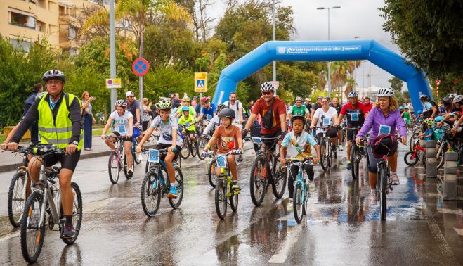 La lluvia no ha impedido este domingo que un gran número de jerezanos de todas las edades hayan participado con sus bicicletas en la Marcha Ciclista de la 'Bici-Amistad' dentro de los eventos que está organizando el Ayuntamiento de Jerez en la Semana de la Movilidad. Los interesados han podido inscribirse hasta una hora antes de su comienzo a las 11 de la mañana para participar en un recorrido familiar de 8,5 kilómetros. La salida se ha producido en El Corte Inglés y la llegada en el Paseo de las Viñas. Además, la jornada ha estado acompañada de actividades para los más pequeños y detalles para todos los participantes. Además, al final de la prueba ha habido sorteos entre los inscritos.