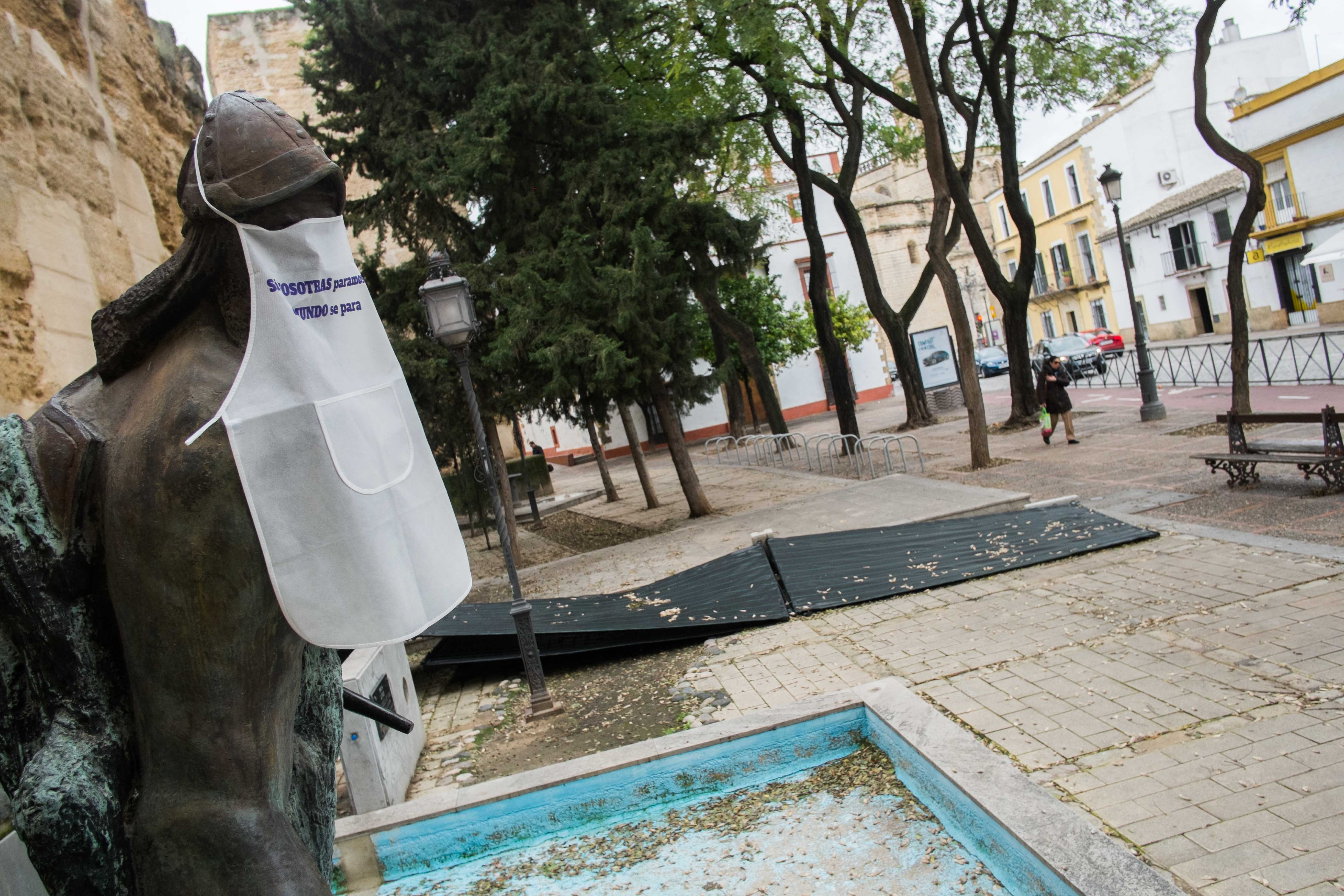 Varias esculturas de Jerez amanecen con delantales reivindicativos con motivo de la manifestación del próximo 8 de marzo, Día Internacional de la Mujer.