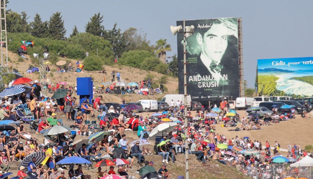 Llamaba la atención ver en lo más alto, apretando el sol hasta los casi 40 grados, el rostro de Federico García Loca desde una curva del Circuito de Jerez-Ángel Nieto. A un lado, un mar de sombrillas como un domingo de agosto en la cercana playa de Valdelagrana; al otro extremo del asfalto, el graderío repleto bajo la enorme valla dedicada al poeta granadino dentro la campaña Andalusian Crush de Turismo Andaluz. Jerez y Granada compiten por ser Capital Europea de la Cultura en 2031, pero la potencia visual del contraste cultural, lúdico, deportivo y turístico con el que se complementan las imágenes es sublime.