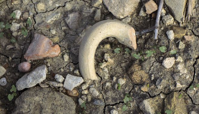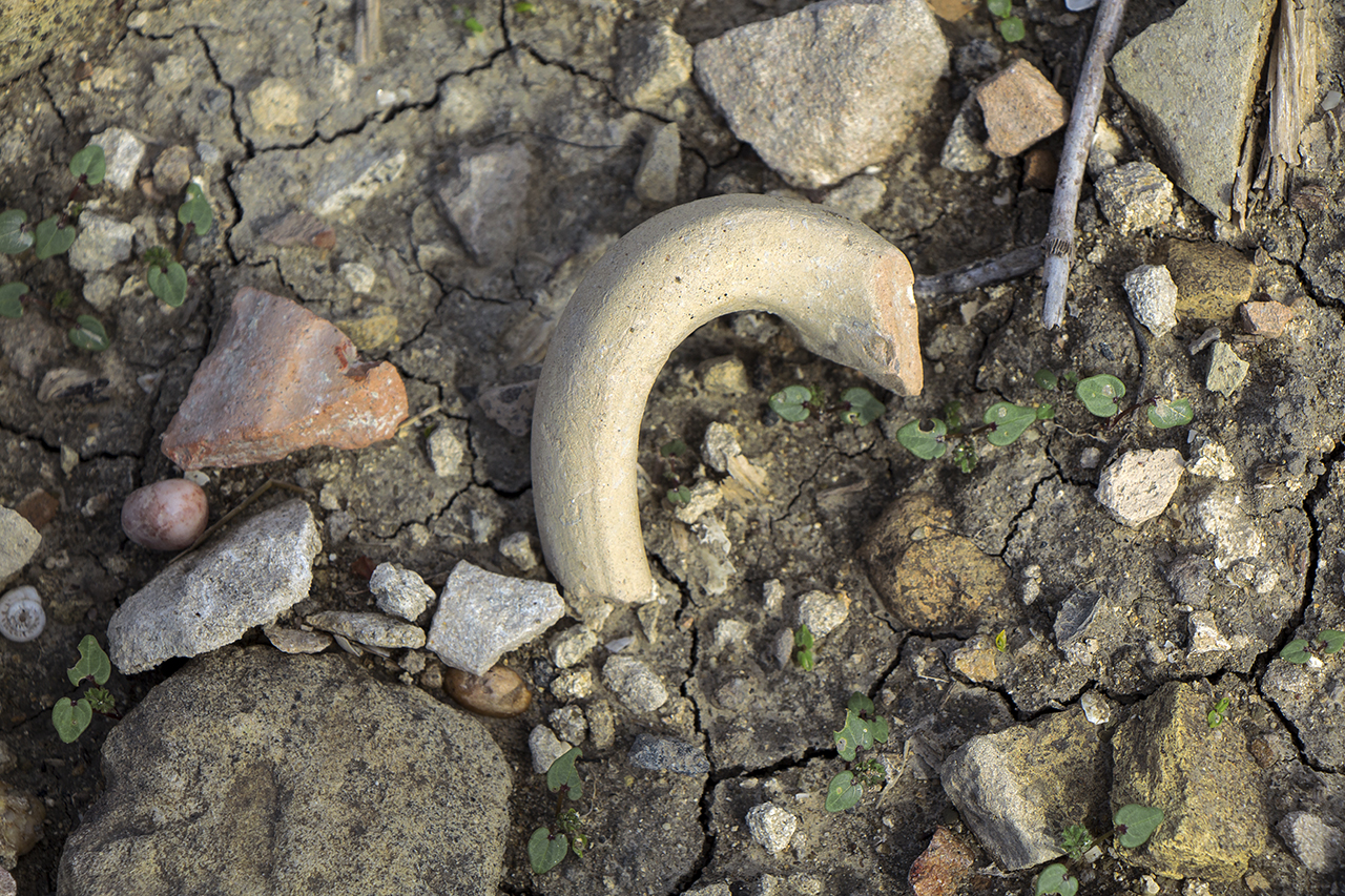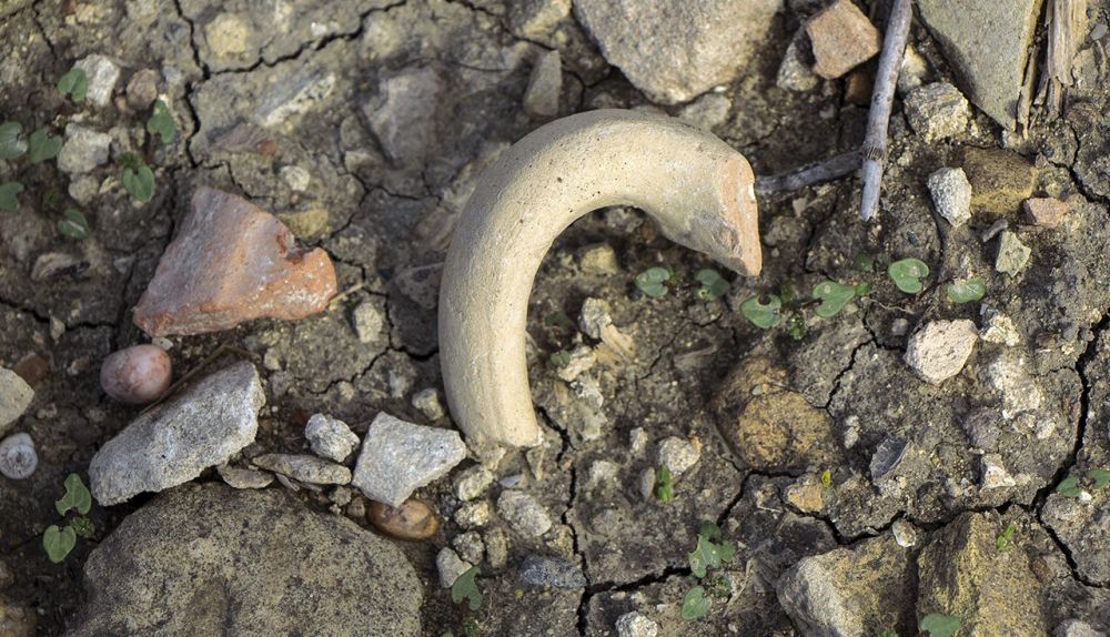 En el camino de subida al cortijo habremos dejado a la izquierda un antiguo pozo con abrevadero y a la derecha, unos muros de contención de “piedra seca” que, por un momento, nos habrán recordado a la antigua fortificación que debió alzarse en estas lomas. Esta roca -arenisca calcárea del Mioceno- que fue empleado como material de construcción, aflora en los puntos más altos de la Loma de Alijar sobre las moronitas o albarizas que sirven de base a las colinas de los campos de cultivo (11). La piedra de mayor contenido calizo fue utilizada siglos atrás para la extracción de cal, no en balde una de las hazas del cortijo conserva el nombre de “La Calera”. Desde lo más alto, descubriremos también en las laderas otros tres grandes pozos que abastecieron al ganado que en otros tiempos pastaba en estas dehesas y a los animales de labor del cortijo. Entre los pozos, numerosos fragmentos cerámicos son aún testigos de la presencia romana y andalusí a la que hacíamos referencia.