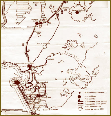 Parece también más o menos claro el camino de Gades hasta “Ad Pontem”, puente de Suazo en San Fernando, y a través del barrio Jarana y la carretera C-133 hacia el punto fiscal de “Ad Portum”, más probablemente El Tesorillo en El Portal que Bolaños o El Puerto de Santa María.