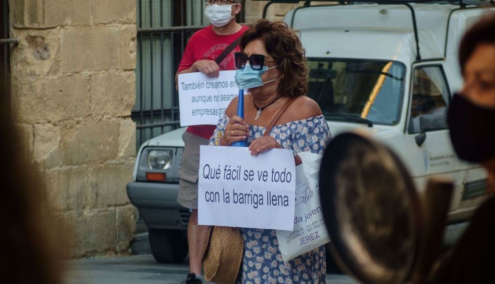 Una enorme pitada se escucha desde las calles aledañas. El epicentro de la protesta, donde hay personas con pitos, silbatos, matracas y todo tipo de utensilios, es la calle Consistorio, frente al Ayuntamiento de Jerez. Allí se reúnen cada lunes y jueves un grupo de comerciantes del centro que piden la agilización de las obras del eje Corredera-Esteve-Santa María-Cerrón. “Es prioridad absoluta que podamos afrontar la campaña de Navidad, que para las empresas de la zona comienza en octubre, con las calles despejadas, limpias, con acceso a los parking y garajes de la zona, y el tránsito en todas las calles”, reclaman desde la recién constituida plataforma de afectados por las obras.