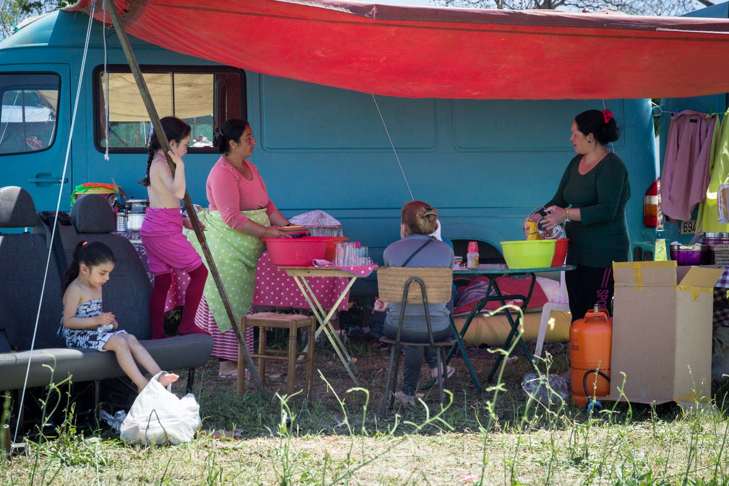 Para asentarse en este espacio durante los días de Feria no necesitan más que llegar y ocupar el espacio. No tienen queja del Ayuntamiento. Lo preparan todo, cuentan: el agua, la luz, limpian el solar. Por las mañanas un chico y una chica llevan a los más pequeños a la escuela. “Los niños vienen con nosotros a todas las ferias. Avisamos en el colegio y ya está”, explican. “Cuando acabe la de Jerez volvemos a casa unas dos semanas y después venimos a trabajar a la Feria de Sanlúcar”.