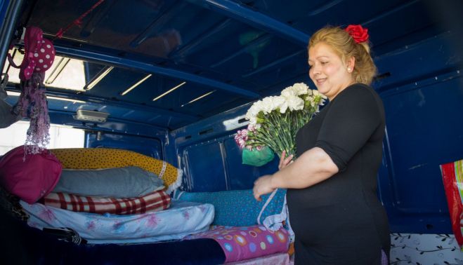 Mari Carmen, de 31 años, se levanta en torno a las nueve de la mañana. Al igual que el resto, lo primero que hace es la compra diaria. No tienen comida ni electrodomésticos, apenas unas botellas de agua y otras bebidas hay en la furgoneta, ésta, por cierto, ordenada e impoluta. “Esa es la cama de los niños (tiene la parejita) y encima el colchón nuestro que lo ponemos en el suelo (de la furgoneta) para dormir”. Ella no trabaja en otra cosa el resto del año. Su marido sí: se dedica a la chatarra y a la venta ambulante de fruta y verduras.