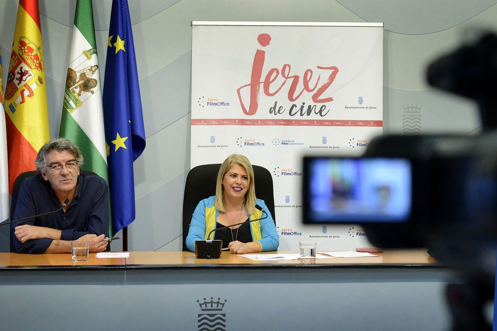 La alcaldesa de Jerez, Mamen Sánchez, junto al responsable de Jerez Film Office, Pedro Grimaldi, ha realizado un balance de los trabajos que se han realizado a través de la oficina desde su recuperación en 2016, período en el que se han atendido a un total de 25 productoras. Así, ha cifrado en "dos millones y medio el gasto directo de las productoras en Jerez".