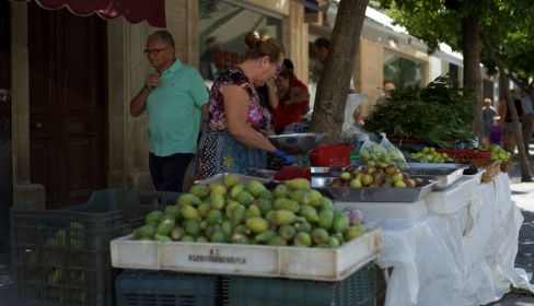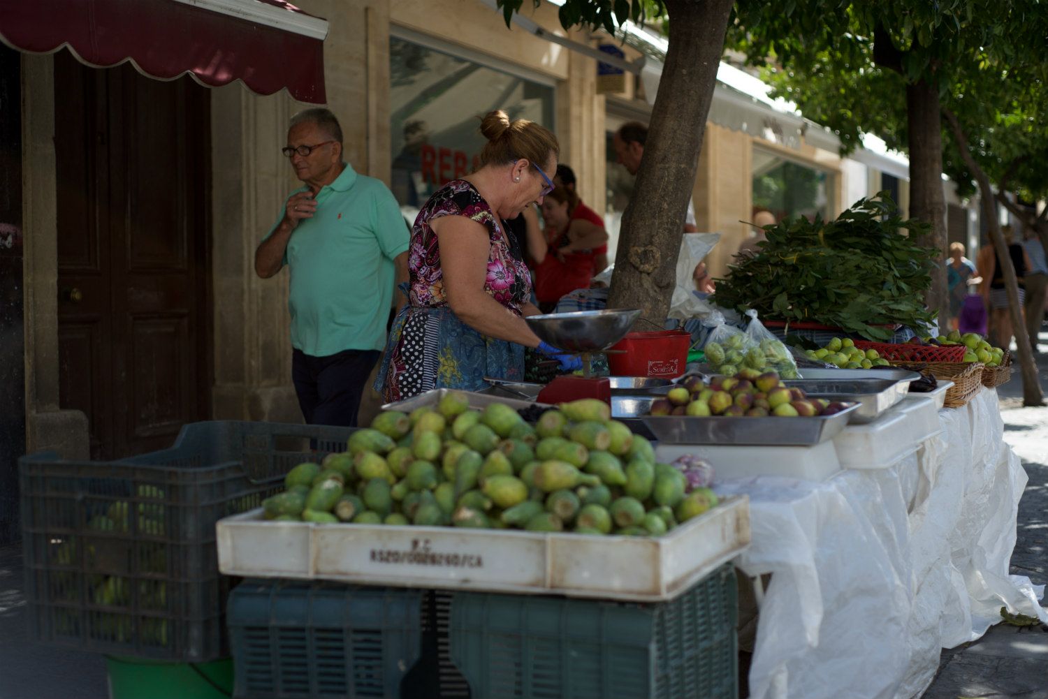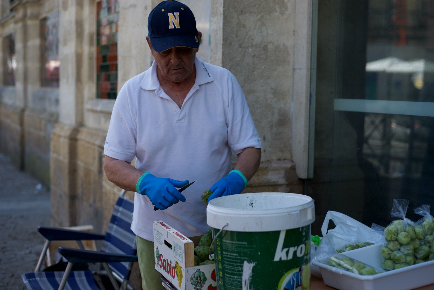 Isabel Prieto, vecina de la calle Sol, tiene 58 años y ya casi ni recuerda los que lleva en su puesto de Doña Blanca. Empezó de niña, ayudando a su madre, y “haga frío, calor o diluvie” planta sus mesas y su género a eso de las ocho de la mañana, que desmantela sobre las dos de la tarde cuando la calle se despuebla. Antiguamente, incluso, se veía corriendo delante de la Policía. Afortunadamente hace años que ni ella ni el resto de vendedores tienen problemas, aunque no tengan ningún tipo de licencia. “Esta es la vida de los pobres. Si nos quitan esto no tenemos nada”. A la sombra de un naranjo vende algarrobas, ajos, limones, laurel, pero ahora en verano, sobre todo, higos chumbos. “Veremos si hay el año que viene”, advierte.
