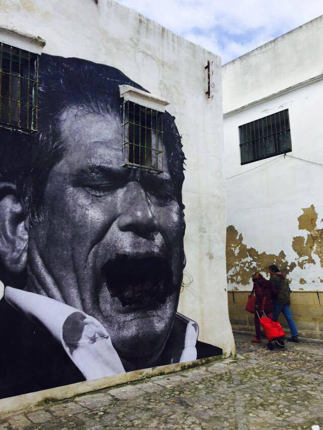 Pero ahí no queda la cosa. Habrán visto también estos días en las calles del centro varios grandiosos foto murales de cantaores jerezanos, una obra del artista y fotógrafo Juan Carlos Toro, enmarcado en su proyecto 'Presencias' y que ha podido sacar adelante en el marco del Festival. Uno de ellos, el de Ángel Vargas, El Mono, colocado en la calle Canto, también amaneció estos días con la boca pintada de negro. El propio Juan Carlos ya se ha encargado de enmendar el entuerto.
