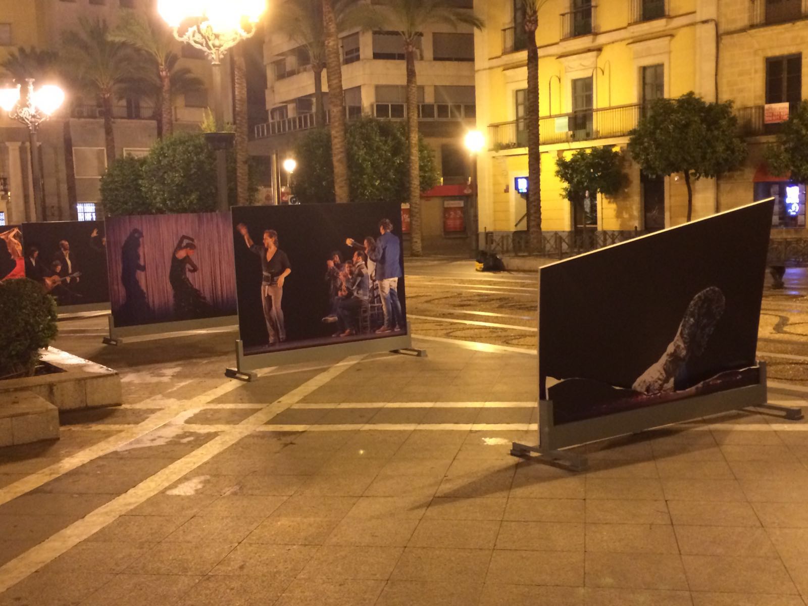 Amanecen partidos un par de paneles de la exposición que el fotógrafo Juan Salido ha montado en la plaza del Arenal apenas doce horas después de inaugurarse oficialmente el Festival de Jerez.