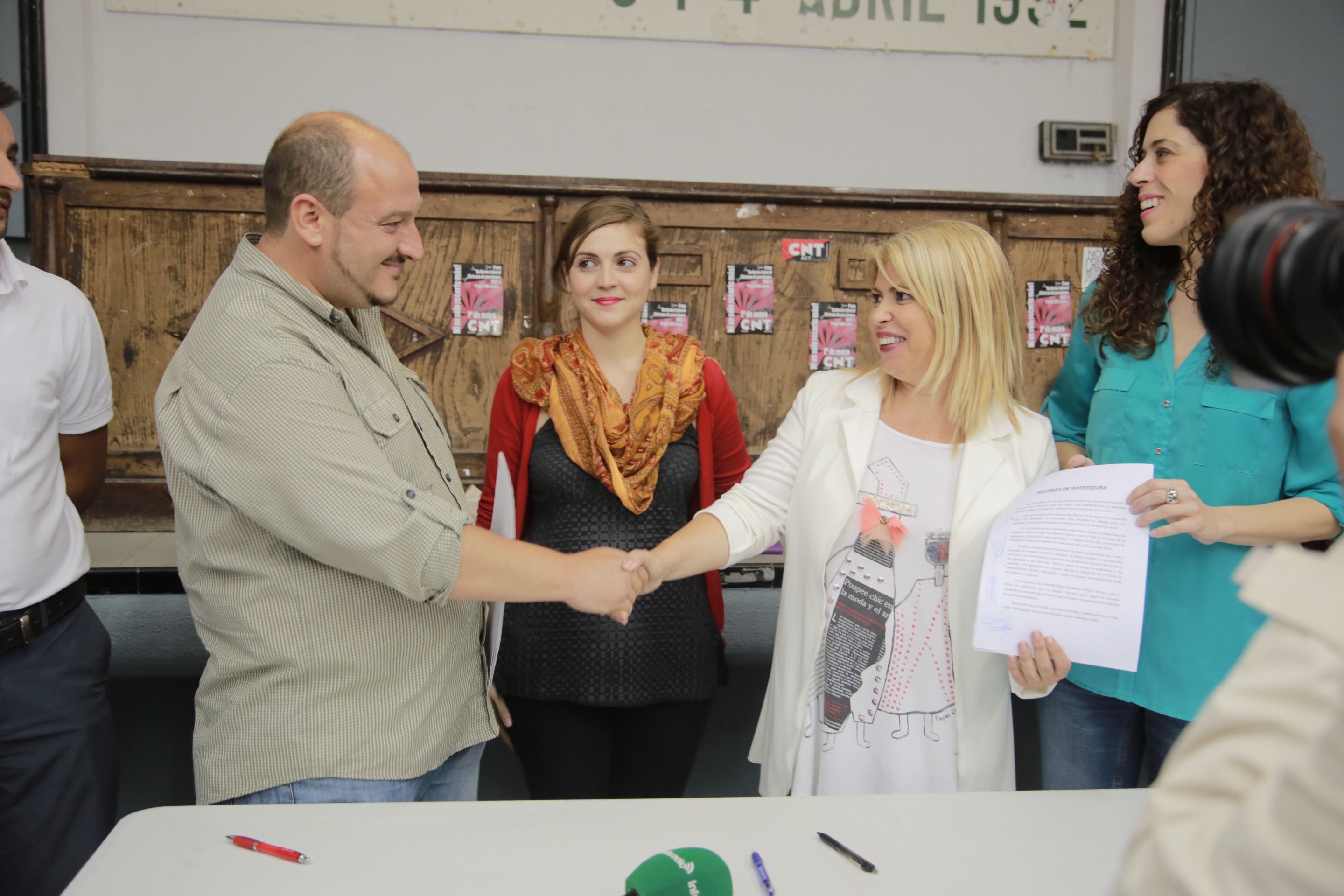 La otra Sánchez, Mamen, agradeció el apoyo mostrado por Ganemos, y desveló que “hasta el último momento hemos intentando que entre en el gobierno” la agrupación de electores. Pero no ha podido ser. “Nos da tranquilidad para saber que en el día a día vamos a dialogar y consensuar”, apuntó Mamen, que dejó la “puerta abierta” a que Ganemos entre en el gobierno más adelante. A la socialista le da “confianza” tener el documento firmado con el “compromiso de apoyo” por parte de Ganemos. Una vez estampado el compromiso hasta se escucharon palmas por bulerías en los sindicatos.