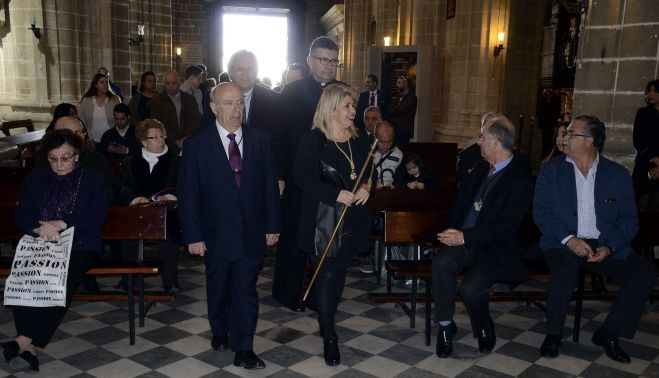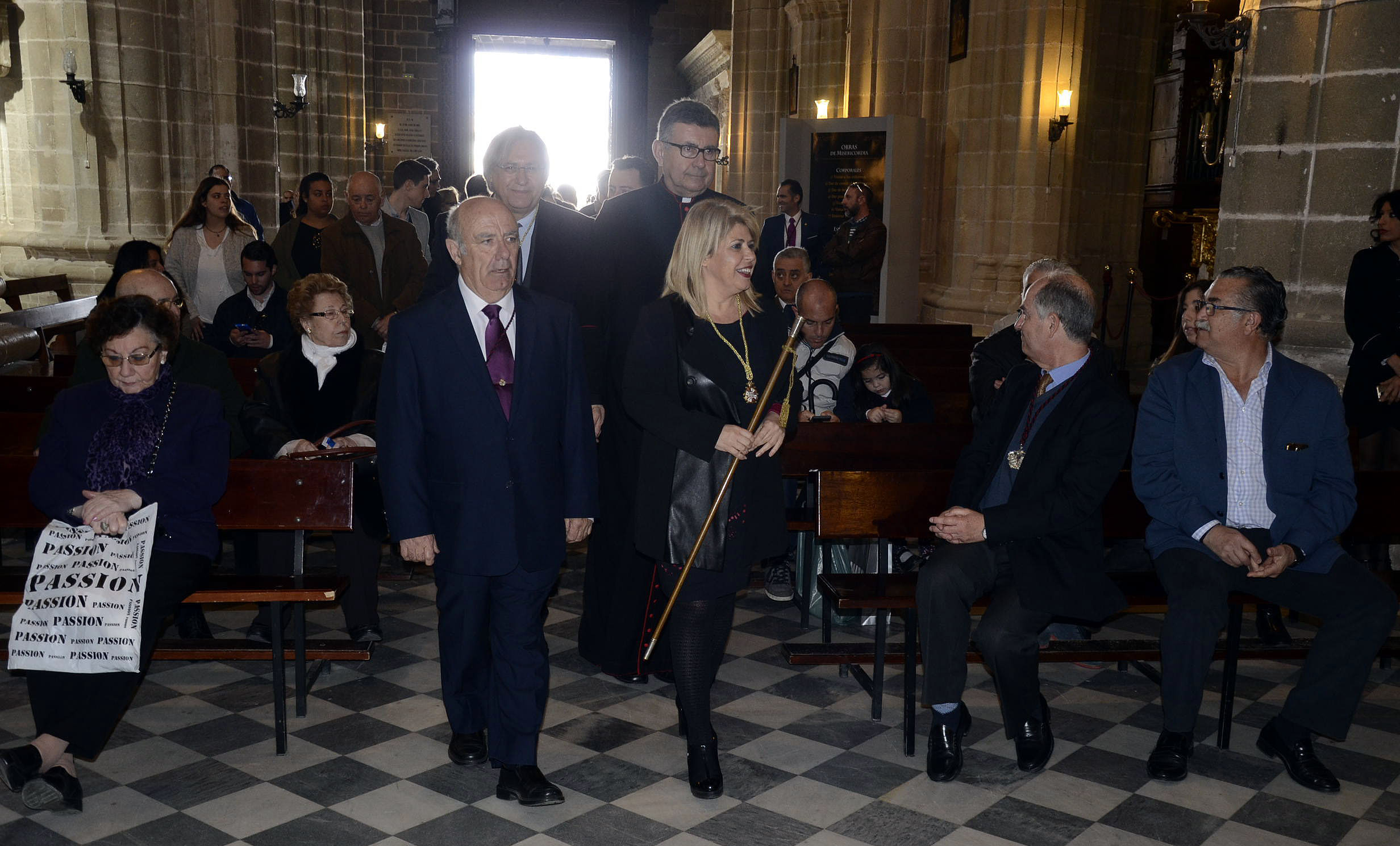 La alcaldesa, Mamen Sánchez, junto a miembros del gobierno municipal y de otros grupos políticos con representación en el Ayuntamiento, como la exalcaldesa María José García-Pelayo (PP) y el líder de Ciudadanos Jerez, Carlos Pérez, ha asistido este Lunes Santo en la Catedral a la ceremonia oficial de renovación de la entrega del Bastón de Mando de la ciudad al Santísimo Cristo de la Viga. La regidora socialista ha aprovechado el acto para destacar el "valor" de la Semana Santa jerezana como un "patrimonio cultural, social y religioso que pertenece todos y cada uno de los ciudadanos de Jerez", reiterando la necesidad y el compromiso de que todos los sectores implicados en la misma "trabajen de forma conjunta en la educación en valores como la solidaridad, la tolerancia, la generosidad y el respeto".