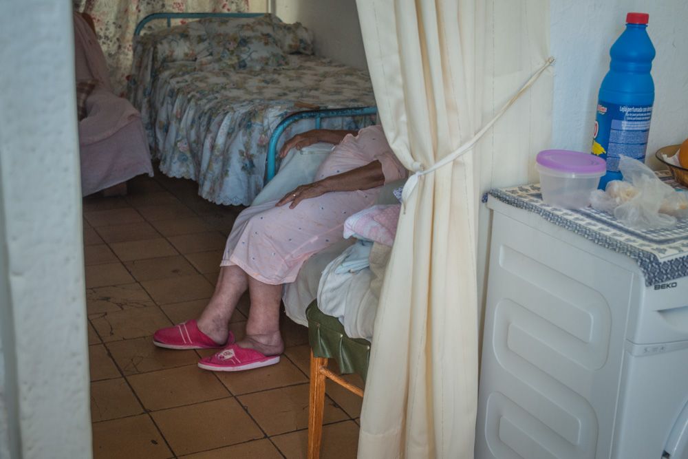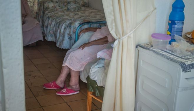 Algunos de sus vecinos han alertado a lavozdelsur.es de la situación el la que vive: el edificio carece de ascensor, lo que prácticamente le impide bajar a la calle. Ha de conformarse con asomarse al balcón del pasillo y ver desde lo alto el transcurso del día a día más allá de su apartamento. Pero lo peor no es eso. Mariana ignora si tiene artrosis, falta de calcio u otra dolencia. Lo que sí sabe es que apenas puede caminar. “No tengo fuerza en las piernas”, se lamenta la octogenaria. No puede subir al baño de su hogar al que se accede subiendo unas escaleras y hace sus necesidades en un cubo que al día siguiente vacía su hijo y las mujeres que la atienden. Y lo mismo le sucede a otras mujeres mayores del barrio.