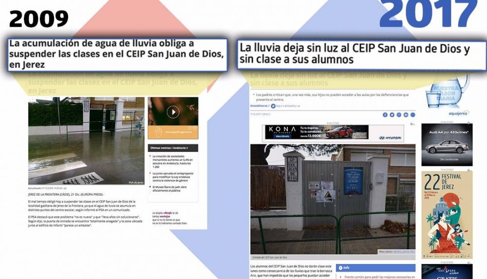 "¿Os imagináis que un hospital, una comisaría de policía u oficina del SAE se inundara cuando llueve un poco más de lo normal y que cierre cada vez que pasa? ¿O que tuviera que suspender su actividad por el calor por carecer de aire acondicionado? ¿Os imagináis que eso pasara desde hace años y nadie hiciera nada?", se ha preguntado la formación política Ganemos Jerez en Facebook. "Pues resulta que si se trata de un colegio sí es normal, y si encima son colegios de barrios periféricos nos encontramos con situaciones que a estas alturas ya no tienen justificación, se mire por donde se mire", ha concluido en el post.