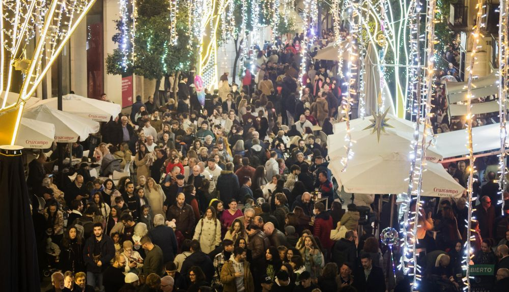 La Navidad en Jerez se ha encendido con el tradicional alumbrado singular instalado para estas fiestas, compuesto por más de un millón de puntos de luz, bombillas leds de bajo consumo. En las calles del centro no se cabía. Si en Alameda Cristina, junto al portal de Belén instalado allí, fue el lugar donde la alcaldesa pulsó el botón de ‘pega’ para inaugurar la iluminación, de calle Larga hasta la plaza del Arenal, donde también se puso en marcha el espectáculo visual y sonoro que se proyecta en la fachada de Urbanismo y que pasa a estar presidida por el árbol de Navidad gigante, el gentío fue impresionante. Como si estuvieran esperando a que pasara la cabalgata que, por cierto ni este viernes se ha querido dar pista alguna de por dónde discurrirá.