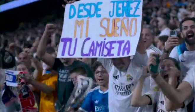En el minuto 36 del encuentro entre el Real Madrid y el Mallorca, disputado este fin de semana en el Santiago Bernabéu, las cámaras de televisión captaron a un aficionado jerezano que portaba un cartel con un mensaje directo: “Desde Jerez. Mi sueño, tu camiseta”. La escena se produjo justo cuando el marcador se igualaba tras el tanto de Arda Güler.