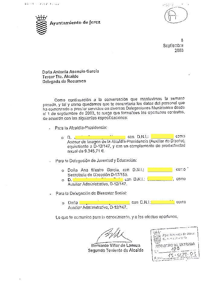 De sobras es conocida la carta que circula por Internet, y que el PSOE anunció hace unos años que llevaría a Fiscalía, en la que el entonces teniente de alcalde Bernardo Villar solicita a la entonces delegada de Recursos, Antonia Asencio, que "formalice" los "oportunos contratos" de acuerdo a unas especificaciones que marca en esa misma misiva. "Tal y como quedamos que te concretaría los datos del personal que ha comenzado a prestar servicios en diversas delegaciones municipales desde el 1 de septiembre, te ruego que formalices los siguientes contratos de acuerdo a las siguientes especificaciones", reza la carta con registro de entrada el 15 de septiembre y en la que no solo se detallan puestos y delegaciones sino incluso una asignación arbitraria de productividad de más de 9.300 euros al año. Según dijo Villar cuando hace unos años se desató la polémica a raíz de la publicación de la carta, la acusación socialista “no se sostiene” y aseguró que “se sobreentiende que la petición se hace a la delegada porque está todo sujeto a la legalidad y se cumplían los requisitos”.
