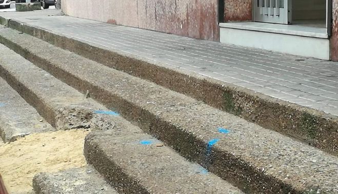 "En un periodo de cuatro meses han rodado varios abuelos por las escaleras", destaca Torres, quien asegura que uno sufrió un traumatismo en una rodilla, y el otro en el costado. "Yo quise que denunciaran, pero no quisieron seguir adelante porque les da miedo emprender acciones contra la administración", agrega. Más allá del peligro que supone los cinco escalones de la entrada del edificio, otro de los problemas es la corta acera que tienen en la calle del Moscatel. "Si vas con un carrito de bebé, tienes que pillar por la carretera, no hay opción de circular por ese acerado, y la de los comercios también es bastante estrecha", explica.