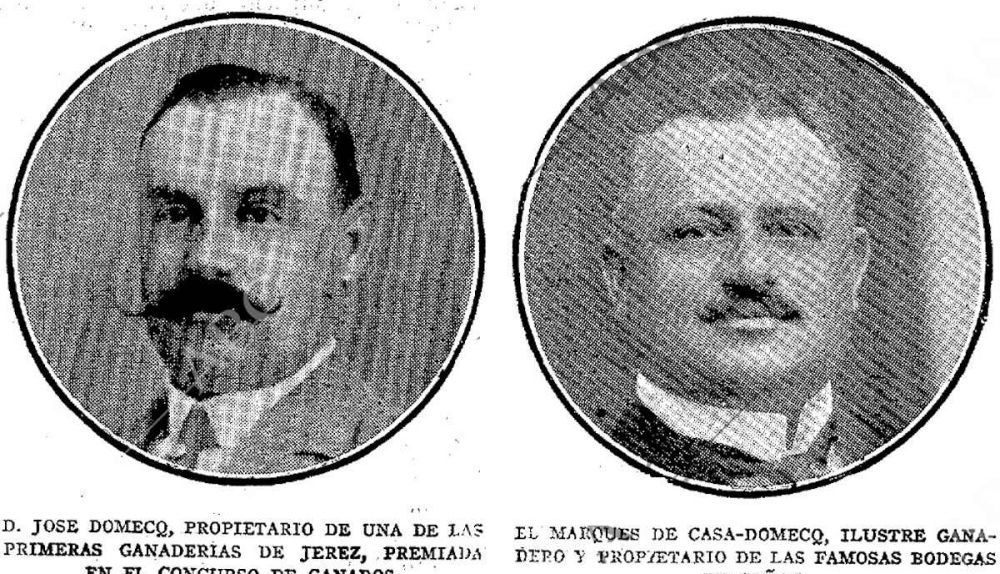 En otro interesante artículo sobre los cinco más importantes ganaderos del Jerez del primer tercio del s. XX, a saber, el Marqués de Casa-Domecq, Bartolomé Bohórquez, Sebastián Orbaneja, Manuel Guerrero y José Domecq, se nos dice de este último: “…inteligente y activísimo D. José Domecq. En la exposición de 1907 al 908, organizada en Madrid, obtuvo D. José Domecq el primer premio del ministerio de Fomento, por un lote de moruecos y ovejas. En la de 1910, celebrada en Sevilla, alcanzó la siguiente recompensa: medalla de oro a semental para producción de lanas; otra medalla de oro a semental también para producción de carnes, y el premio extraordinario del ministerio de la Guerra (1.500 pesetas), otorgado por unanimidad a su caballo Bienvenido, magnífico ejemplar. Por las lanas presentadas un gran premio en la Exposición de Bruselas de 1910, el primer premio y campeonato en la Exposición de 1907 celebrada en Madrid, así como también dos primeros premios en la recientemente organizada en esta corte, los cuales se han concedido aun lote de dos magníficos potros, y a las ovejas presentadas”. El Mº de Fomento, mediante BOE de 8 de junio de 1909, le concedió la Gran Cruz de la Orden civil del Mérito Agrícola a José Domecq Núñez de Villavicencio.