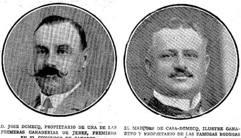 Se ve que en 1914 ya José Domecq había alcanzado un gran poder económico, pues se da a conocer como ganadero de toros de lidia: “Corrida de Beneficencia. Cádiz (domingo, mañana). Reina gran animación para la corrida de Beneficencia, organizada por la Asociación de Caridad. Los trenes llegan atestados de forasteros, especialmente de Jerez por inaugurarse en esta corrida la ganadería de su paisano don José Domecq…” (La Correspondencia de España, 1914-08-03). Sus galgos ganan los primeros premios en las carreras que se organizan en Jerez: “Han continuado las pruebas de galgos. Corren primeramente Ligero, Mizziam, Ligorita, Norica, Espartera y Belmonte, propiedad, respectivamente, de los Sres. Tomé, Jácome, Fernando el Gallo, D. José Domínguez, D. Julio Hidalgo y D. José Domecq, ganando los cuatro últimos” (La Correspondencia de España, 1915-01-05).