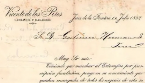 Vicente de los Ríos operó ampliamente desde Jerez, y en 1892 se localiza un documento suyo, datado en Jerez, en el que, por motivos médicos, ha de marchar al extranjero y en donde, de cara a otros ricos propietarios de Jerez, certifica su firma suplente subrogada: