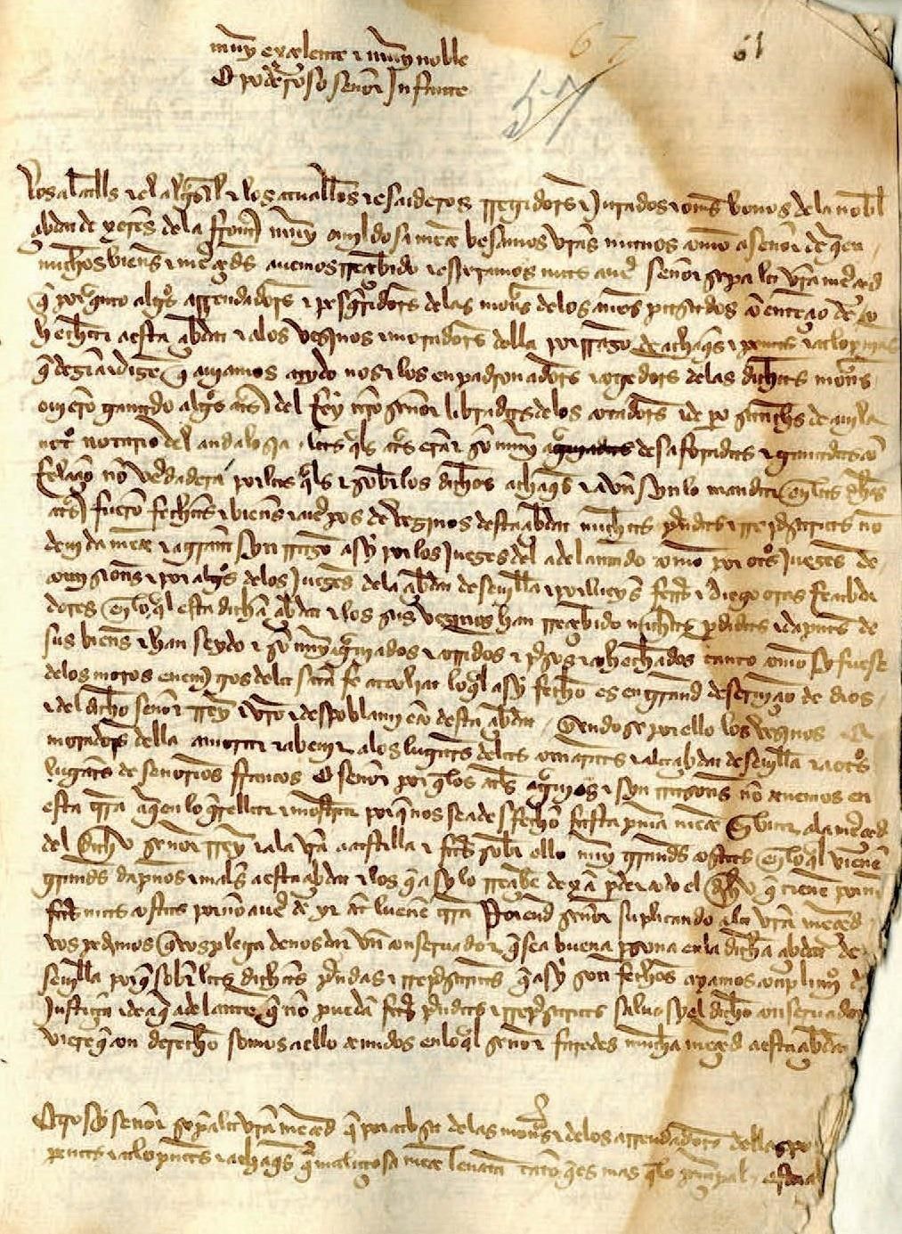 PÁRRAFO 1º: Que algunos arrendadores y pesquisidores de los años pasados, frente al buen trabajo del concejo y de empadronadores y cogedores de monedas, apremiaban a los vecinos de Jerez; que esto lo hacían con muchas presas y represalias, y con consentimiento de varios jueces (los del Adelantado, los de comisiones, los de la ciudad de Sevilla, etc.), hasta el punto que los vecinos son corridos tanto como si fueran moros; que había riesgo de despoblamiento hacia lugares comarcanos, como Sevilla o lugares de señoríos francos; “… e no tenemos en esta tierra a quien lo querellar”; y se pide un “conservador” en la dicha ciudad de Sevilla.