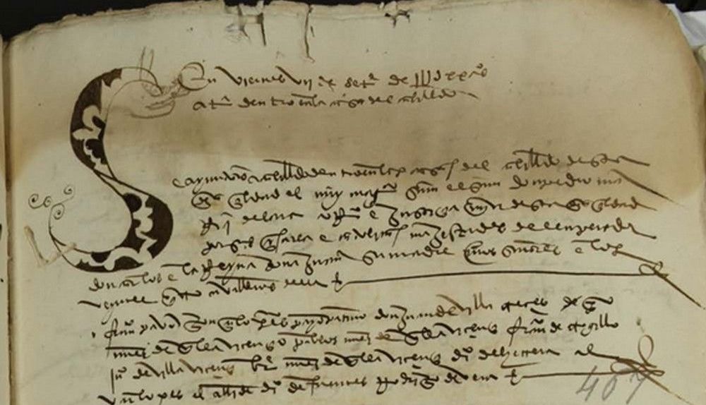 Es muy infrecuente encontrar una letra capital de estas características iniciando un acta capitular de Xerez. Pero esta divertida letra serpiente se encuentra dibujada en la de 7 de septiembre de 1520. El texto dice así: