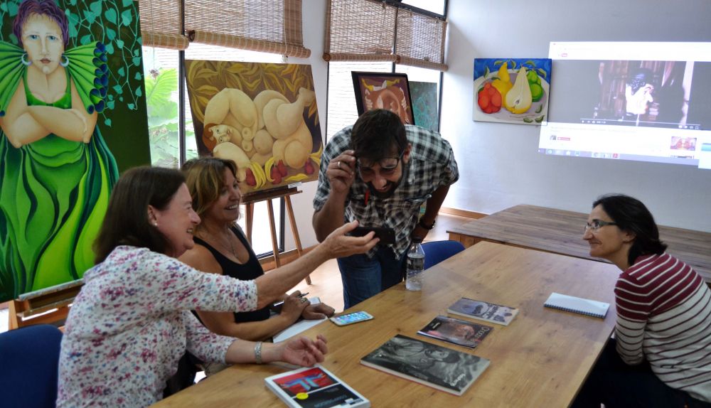 El taller está repartido en dos turnos y da la casualidad que en el de la mañana son todo mujeres, en el siguiente es justo al revés. En un turno matutino, la artista gallega Inés Gontad García asiste para aprender a combinar el dibujo con la fotografía y para mejorar su promoción en las redes sociales. Carmen García lleva un blog de cocina desde hace cuatro años —De Sol y Sal— y quiere embellecer la galería gráfica de sus propias elaboraciones en su plataforma y en Instagram. Amparo Bou es periodista, trabaja en Sinlímites Comunicación y participa en el taller para aprender a sacar mejores fotografías en eventos y exposiciones. Todas ellas están por una necesidad profesional. No hace falta que se compren una cámara, es suficiente con su teléfono móvil y alguna que otra aplicación.