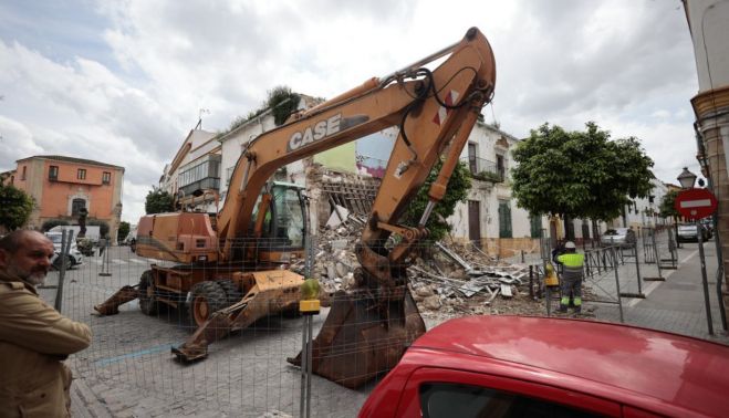 Primeras intervenciones en la calle Zarza del barrio de San Miguel en Jerez. Este jueves 3 de abril una máquina excavadora ha actuado sobre el derrumbe parcial que sufrió la finca número uno el pasado domingo.