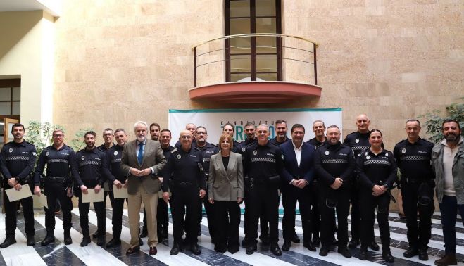 La alcaldesa de Jerez, María José García-Pelayo, ha dado la bienvenida a los 18 nuevos agentes de la Policía Local que han asumido sus nuevos cargos tras superar las pruebas de promoción interna. Acompañada por los tenientes de alcaldesa Agustín Muñoz e Ignacio Martínez y el jefe de la Policía Local, Manuel Cabrales, García-Pelayo ha felicitado a los agentes por su ascenso, que incluye dos nuevos inspectores, ocho subinspectores —uno de ellos mujer— y ocho oficiales.