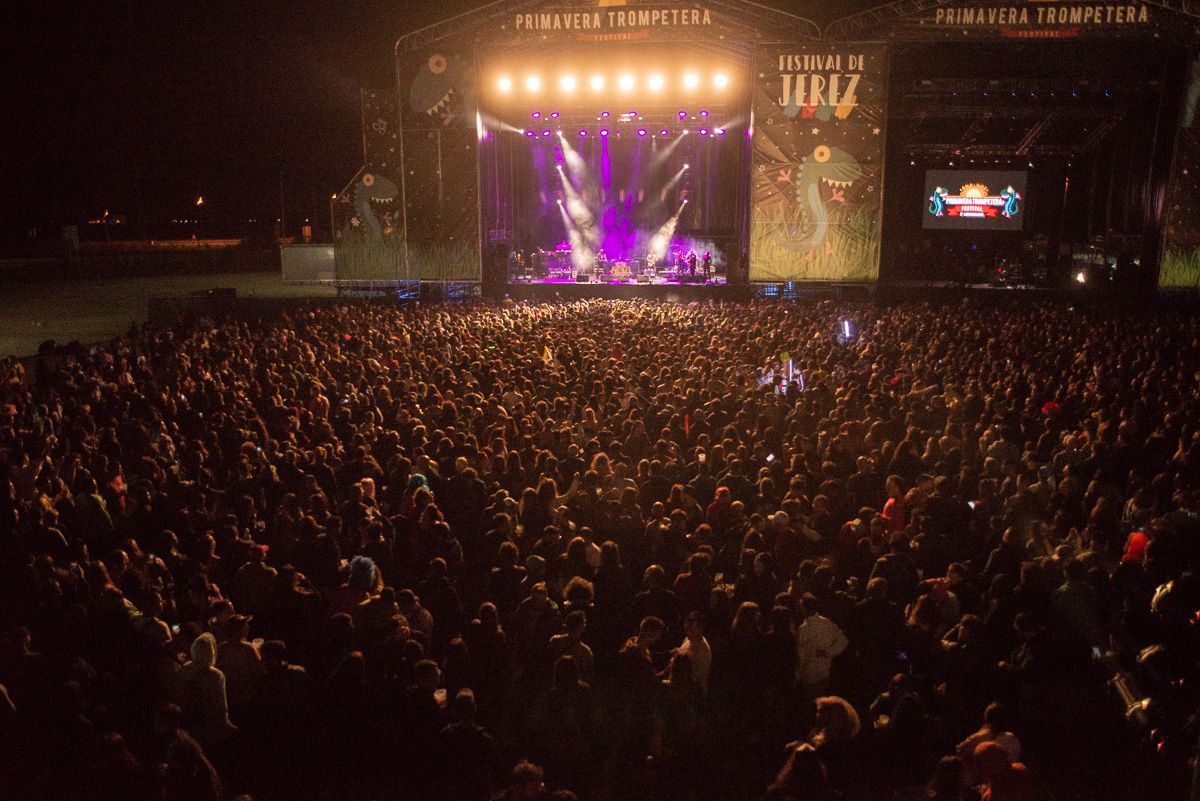 La noche casi ha caído. Luces, micros en mano y muchas ganas de escuchar los ideales y mensajes modernos que los artistas emergentes y consolidados de la escena más urbana tienen que ofrecer. Apuntan y disparan versos cargados de ritmo en la primera jornada del Primavera Trompetera, el macrofestival que inicia la temporada en Jerez. El primero de una extensa lista de citas musicales programadas por toda España arranca un año más en la zona de aparcamiento del circuito Ángel Nieto, repleto de jóvenes y no tan jóvenes amantes del género que triunfa por todos los rincones.