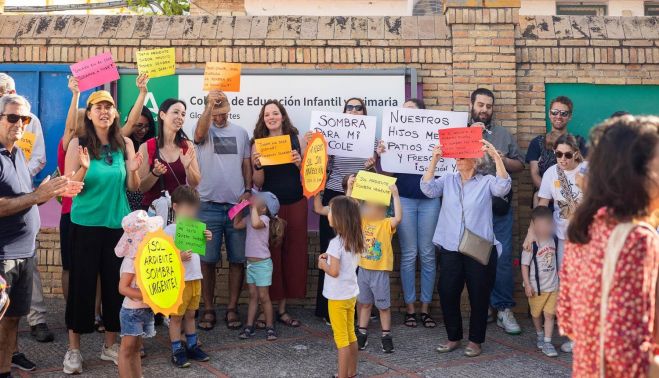 Niños y niñas a más de 40 grados en el patio del CEIP Gloria Fuertes de Jerez, un colegio sin sombra, un "desierto", como se ha podido leer en algunas de las pancartas que han mostrado esta mañana las madres y padres de Infantil que se han concentrado a la puerta del colegio para pedir sombra para el alumnado.