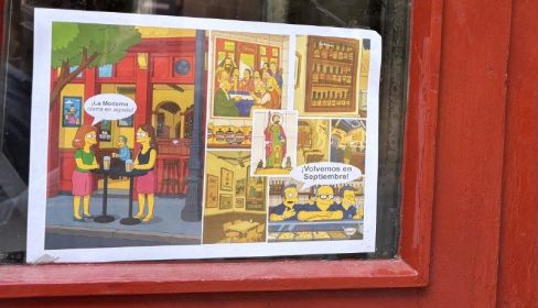 En lugar de un anuncio convencional, el aviso se ha realizado mediante una ilustración inspirada en la serie Los Simpson. La viñeta, colocada en la fachada del bar, muestra a personajes en distintas escenas que aluden tanto al ambiente del local como al cierre temporal.