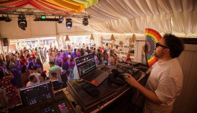 “Dime que sientes lo mismo que yo, dime que me quieres, dímelo, cuando zarpa el amor”. Los altavoces retumban con un temazo de Camela. En un rincón de la Feria del Caballo se divisa un oasis de libertad. Sin soltar los abanicos para aliviar el calor sofocante, muchas personas sucumben al baile en la caseta de JereLesGay, la asociación del colectivo LGBTIQ+ en Jerez.