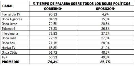 En cuanto a los informativos de las desconexiones provinciales de Canal Sur TV, destacan los de Cádiz y Sevilla, donde la oposición alcanzó el 53,7% y el 52,4%, respectivamente, del tiempo de voz de los actores políticos. En el lado opuesto se situó la desconexión de Canal Sur TV en Jaén, donde los políticos de la oposición obtuvieron el 28,7% del tiempo de palabra en los informativos durante el tercer trimestre.