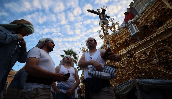 Varios costaleros, junto al paso de la Lanzada. MANU GARCÍA