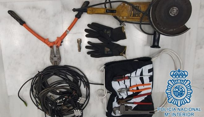 Posteriormente se realizó una requisa en los accesos del recinto municipal, comprobando que la cerradura de la puerta de entrada se encontraba fracturada y junto a ella varios tubos de cobre cortados y una bolsa de tela negra la cual contenía diversas herramientas: un destornillador, un alicate de corte, unas tenazas, una cizalla, una radial y entre ellas una llave grifa de igual anchura del diámetro del bombín fracturado que también estaba en el interior de la bolsa.