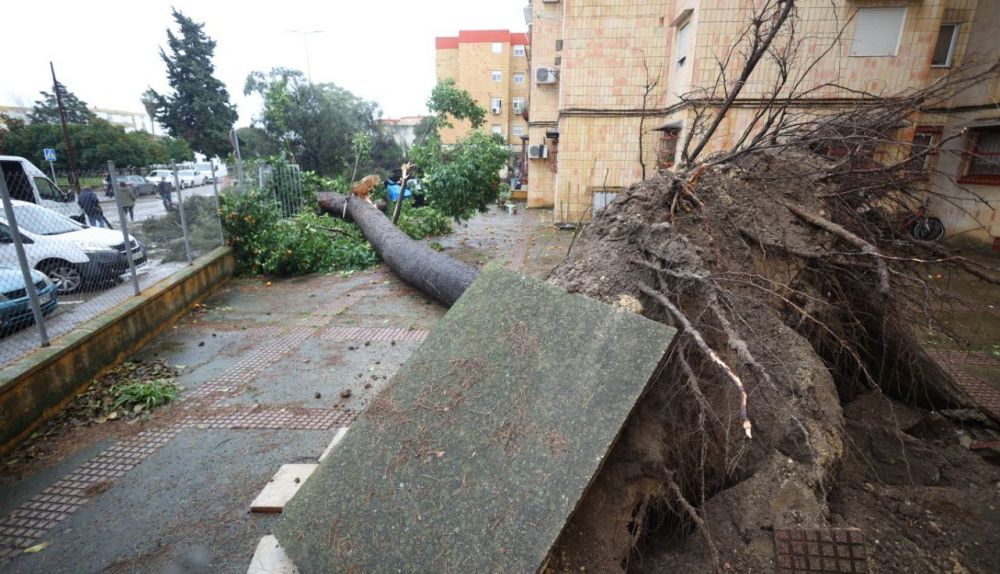 Los vecinos de la plaza Ubrique aseguran que habían denunciado el deterioro de este árbol, que ha caído por las fuertes rachas de viento que azotan la ciudad este miércoles, cuando se alcanzaron los 90 kilómetros por hora en los primeros tramos de la mañana.