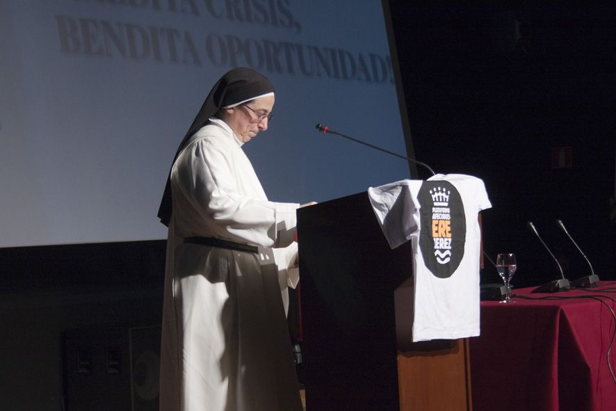 También criticó a la propia institución a la que pertenece: "La Iglesia se ha ido alejando del mensaje central del evangelio. Es imposible servir a Dios y al dinero, porque servirás a uno o a otro". Al terminar casi no la dejaban bajar del escenario. Todos querían hacerse una foto con ella o charlar un rato. "Me ha dado un beso y la mano, ya me voy yo contenta", exclamaba una señora saliendo de la Atalaya. "¡Y tengo también un autógrafo suyo que me trajo mi hermano!", añadió ilusionada. [divider] La conferencia, titulada Maldita crisis, bendita oportunidad, ha sido organizada por #1MayoEmprende en colaboración con la asociación de comerciantes Acoje, el Ayuntamiento de Jerez, Almudena Plaza y la empresa Salvartes.
