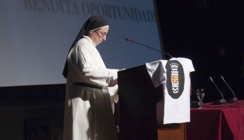 La expectación era máxima. Desde primera hora de la mañana se formaron colas en la Atalaya, nadie quería quedarse fuera. Con todas las sillas ocupadas y gente de pie en los laterales comenzó la esperada intervención de Sor Lucía Caram, la monja dominica contemplativa más famosa del país. Presenta un programa de cocina y es habitual su aparición en programas de debate como Las Mañanas de Cuatro. Cada vez que interviene en algún acto no deja a nadie indiferente, como ha ocurrido en Jerez. Se moja y no tiene miedo a decir lo que piensa, tanto en temas políticos como de toda índole. "Digo lo que digo porque no recibo subvenciones", comentó, provocando la risa de los presentes.