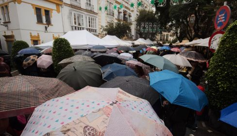 Cambios de ubicación y suspensiones de zambombas a causa de la lluvia. Paraguas abiertos en una en la calle este fin de semana.