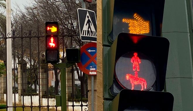 El paso de peatones situado en la calle Pizarro, a la altura del acceso al Museo de Enganches y que comunica con la acera de enfrente donde existe un acceso a la Real Escuela, cuenta desde ahora con un semáforo que advierte que, además de personas, cruzan caballos. Además de ese uso práctico, también se puede interpretar como un homenaje a los caballos y la propia Real Escuela, a la vez que 'sitúa' a turistas y a los propios jerezanos sobre la ciudad en la que están.