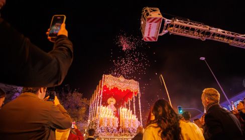 Hoy, ese vínculo se visualiza con fuerza: bomberos presentes en el cortejo escoltando los pasos y un momento especialmente simbólico en la recogida, con el homenaje que rinden a la cofradía.