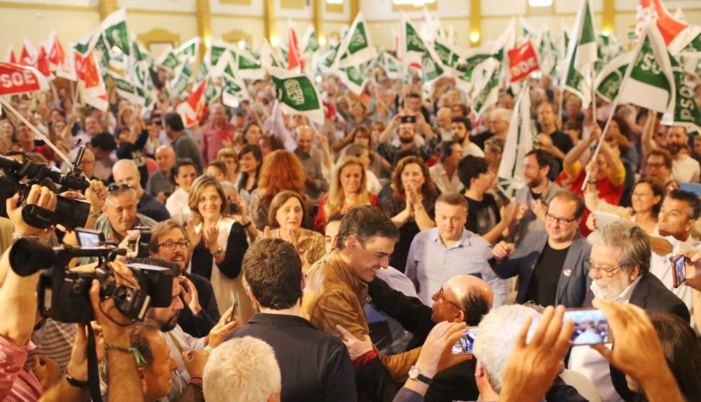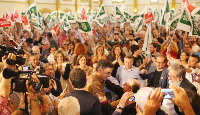 Al candidato socialista lo telonea una ex concejal del PSOE en el Ayuntamiento de Jerez, África Becerra, quien anima a iniciar “la reconquista del PSOE para la militancia” y a tener un “programa progresista, de izquierdas, valiente”. También Carlos Benítez, de las Juventudes Socialistas de Jerez, quien defiende que “aquí no viene la gente amarrada y sí con ganas de cambio”, así como Antonio González, alcalde de San José del Valle, que apunta: “Somos muchos más alcaldes los que te apoyamos pero el miedo puede, yo no vivo de la política, por eso no tengo miedo”, recogiendo de primera mano la idea de que se está sometiendo a presiones a muchos militantes para que voten una determinada candidatura. El remate del acto lo pone La Internacional, el himno obrero por excelencia, que deja a las claras la intención de Pedro Sánchez. ¿Logrará agruparlos a todos en la lucha final?