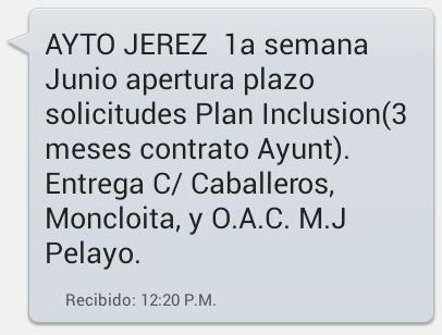 Si los beneficiarios del Plan de Empleo Joven, que reivindican los seis meses de contratos que les prometieron, ya han dejado claro que quieren soluciones, no más SMS masivos, Pelayo ha insistido también en su estrategia remitiendo otros dos SMS más este mismo lunes en los que puede leerse: "AYTO JEREZ. 1ª semana de junio plazo solicitud Plan local (10 cursos 6 meses compromiso contratación) Entrega C/ Caballeros, Moncloita y O. A. C. M. J Pelayo" y "1ª semana junio apertura plazo solicitudes Plan Inclusión (3 meses contrato Ayunt). Entrega C/ Caballeros, Moncloíta y O.A.C. M. J Pelayo". En la recta final de la legislatura, con más de 33.000 desempleados -unos 4.100 más desde que accedió a la Alcaldía- y con un derrumbe muy serio en las encuestas, el Partido Popular no duda en hacer uso incluso de los resortes y la infraestructura municipal para exprimir al máximo su campaña.